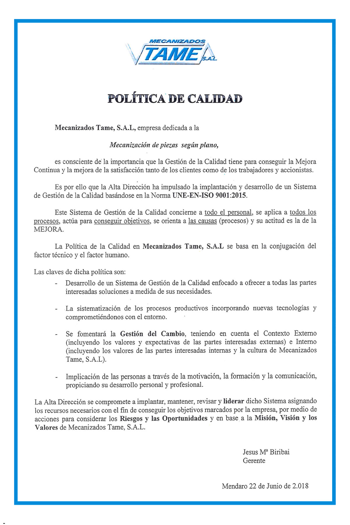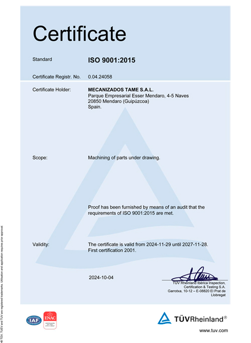 We maintain a commitment to quality backed by the UNE-EN-ISO 9001:2015 Certification, and approved by the trust of its customers. A quality policy oriented to Continuous Improvement, permanent technological innovation and constant training of its employees, guarantee the competitiveness of the company. Mecanizados Tame makes its Quality Policy available to its customers, suppliers and interested parties.